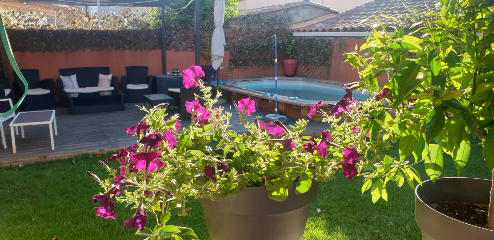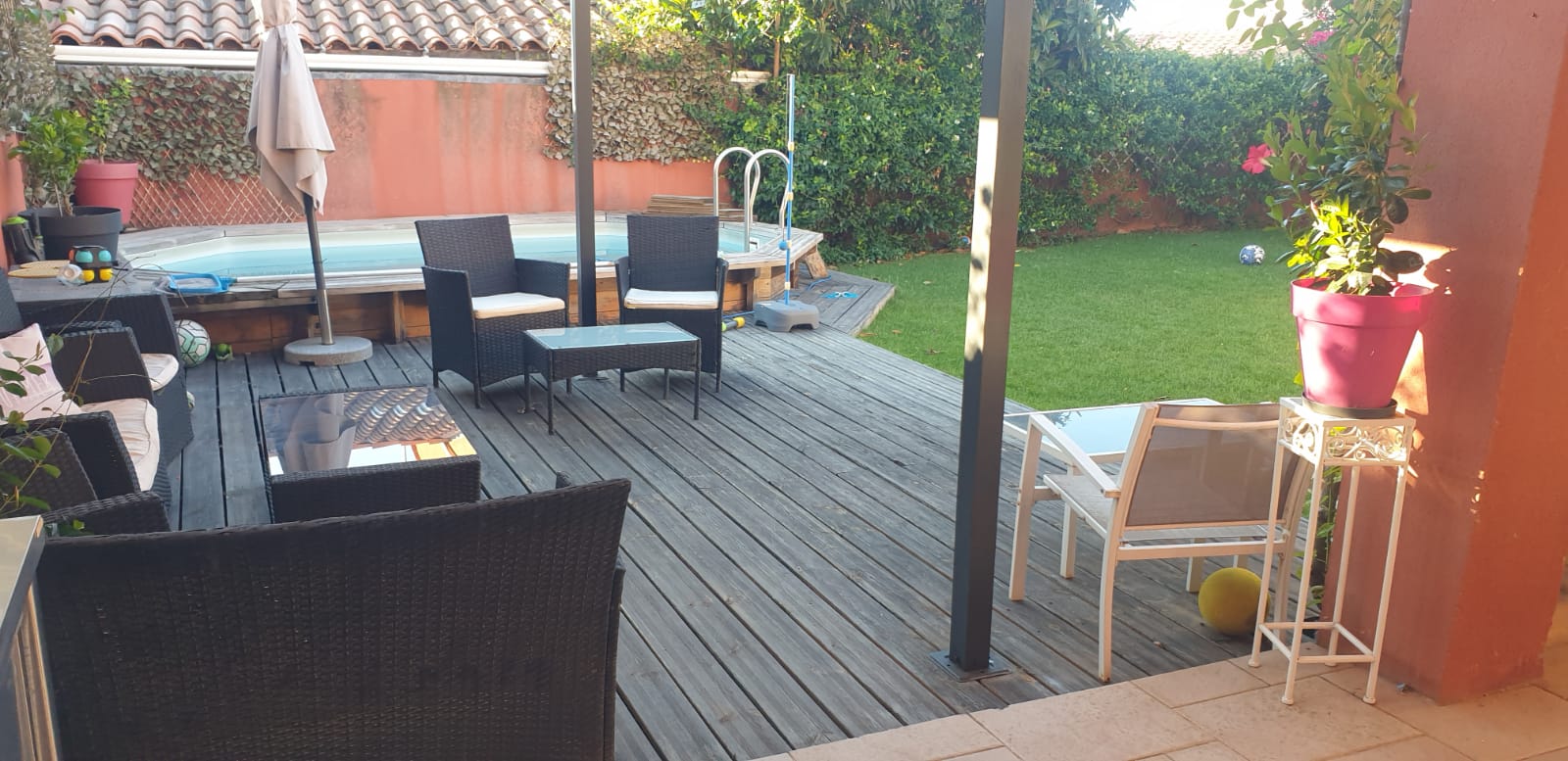 Extérieurs Enchantés : Le terrain de 430 m² accueille une spacieuse terrasse où vous pourrez profiter des douces soirées d’été. La piscine semi-enterrée est un véritable oasis de fraîcheur.