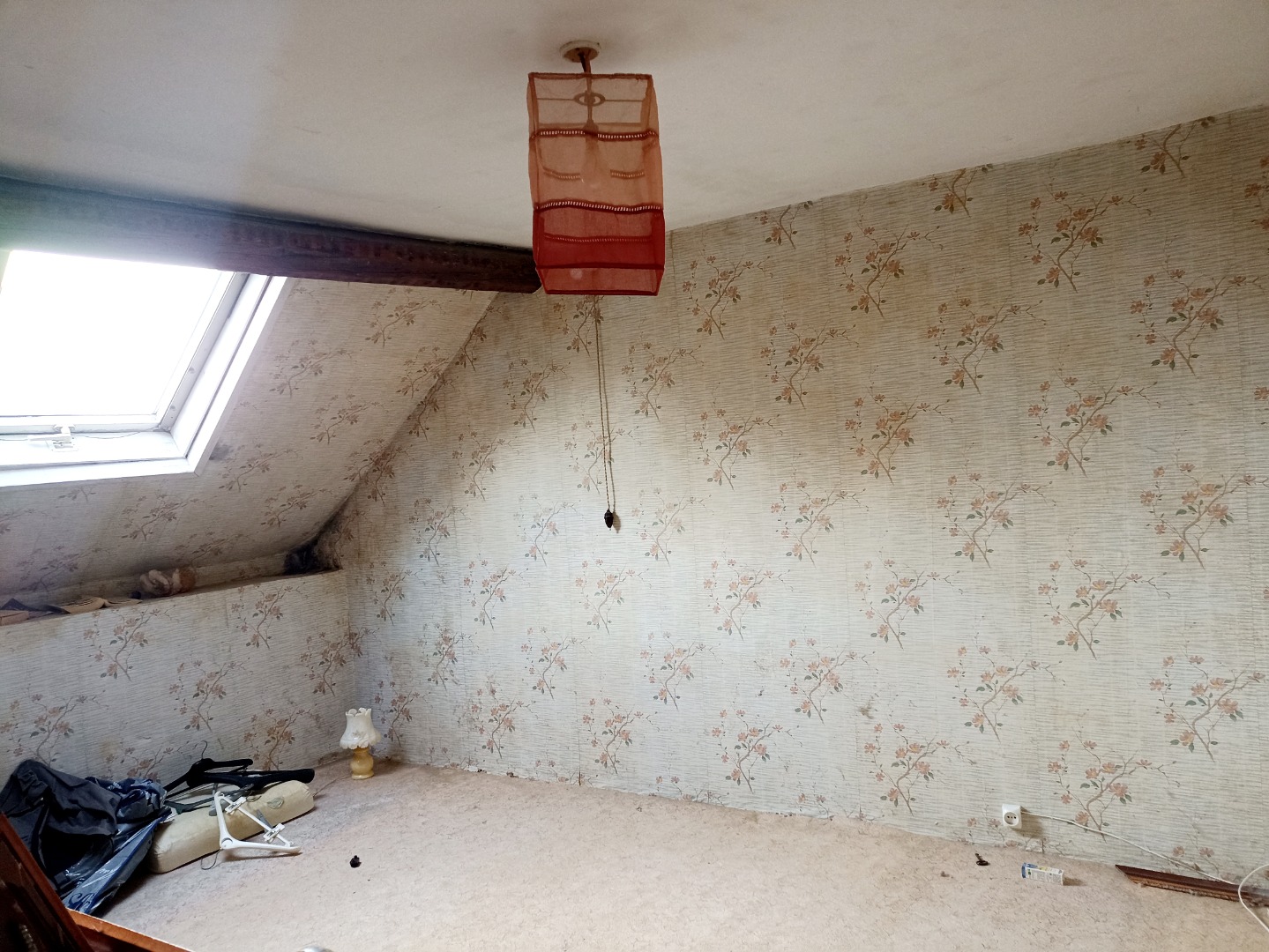 - étage à rénover : bel espace (45m2 au sol) avec un palier (14 m2) et deux chambres + une pièce (10.64/11/9.31 m2 au sol). Possibilité de réorganiser les pièces. Plancher et charpente en très bon état.
