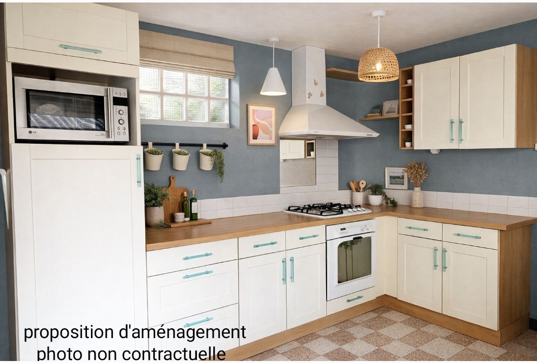 - rdc : hall d'entrée, couloir, salle à manger, salon, cuisine équipée donnant accès sur l'extérieur, salle de douche et WC, chaufferie et garage avec porte motorisée.