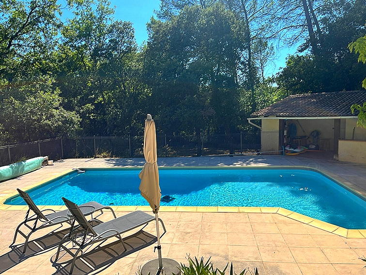 Le coin piscine est un véritable écrin de détente, sans aucun vis-à-vis, avec une piscine au sel en forme de diamant, une douche extérieure et un pool house.