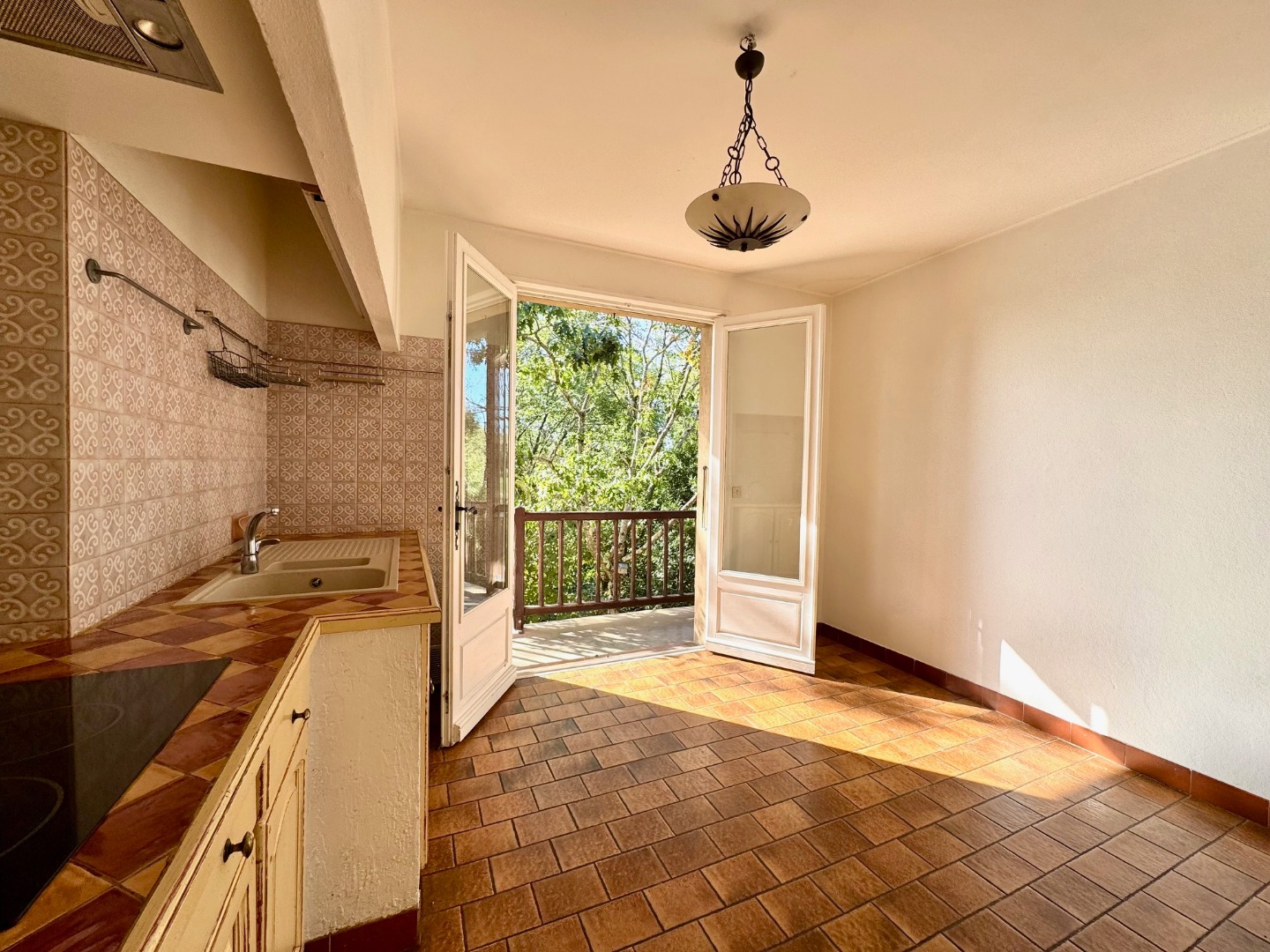 -Une cuisine fonctionnelle et lumineuse, avec accès direct à un balcon offrant une vue dégagée sur la nature.