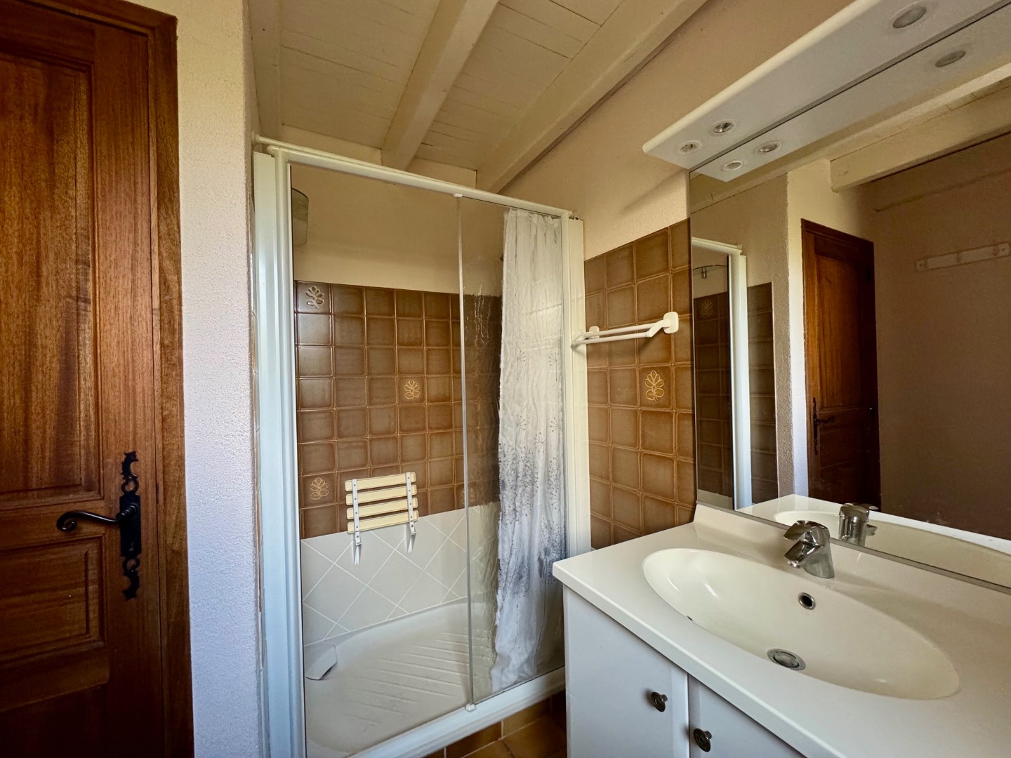 Le rez-de-chaussée comprend également une chambre, une salle de bain avec WC, une salle d’eau et des WC séparés.