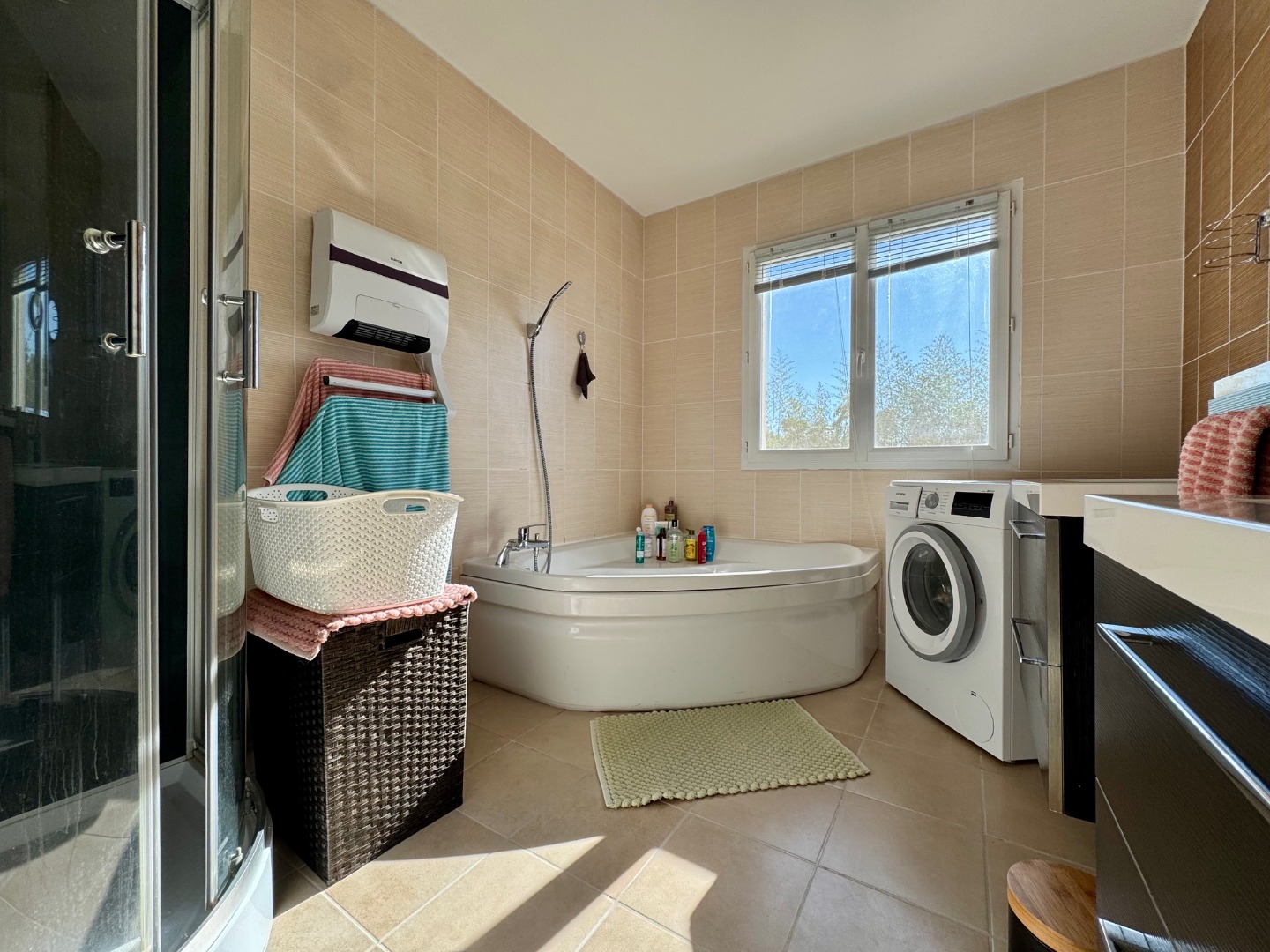 Côté nuit, la maison dispose de trois belles chambres avec placards intégrés (12 à 13 m²), ainsi qu’une grande salle de bain équipée d’une baignoire d’angle, d’une douche et de deux vasques.