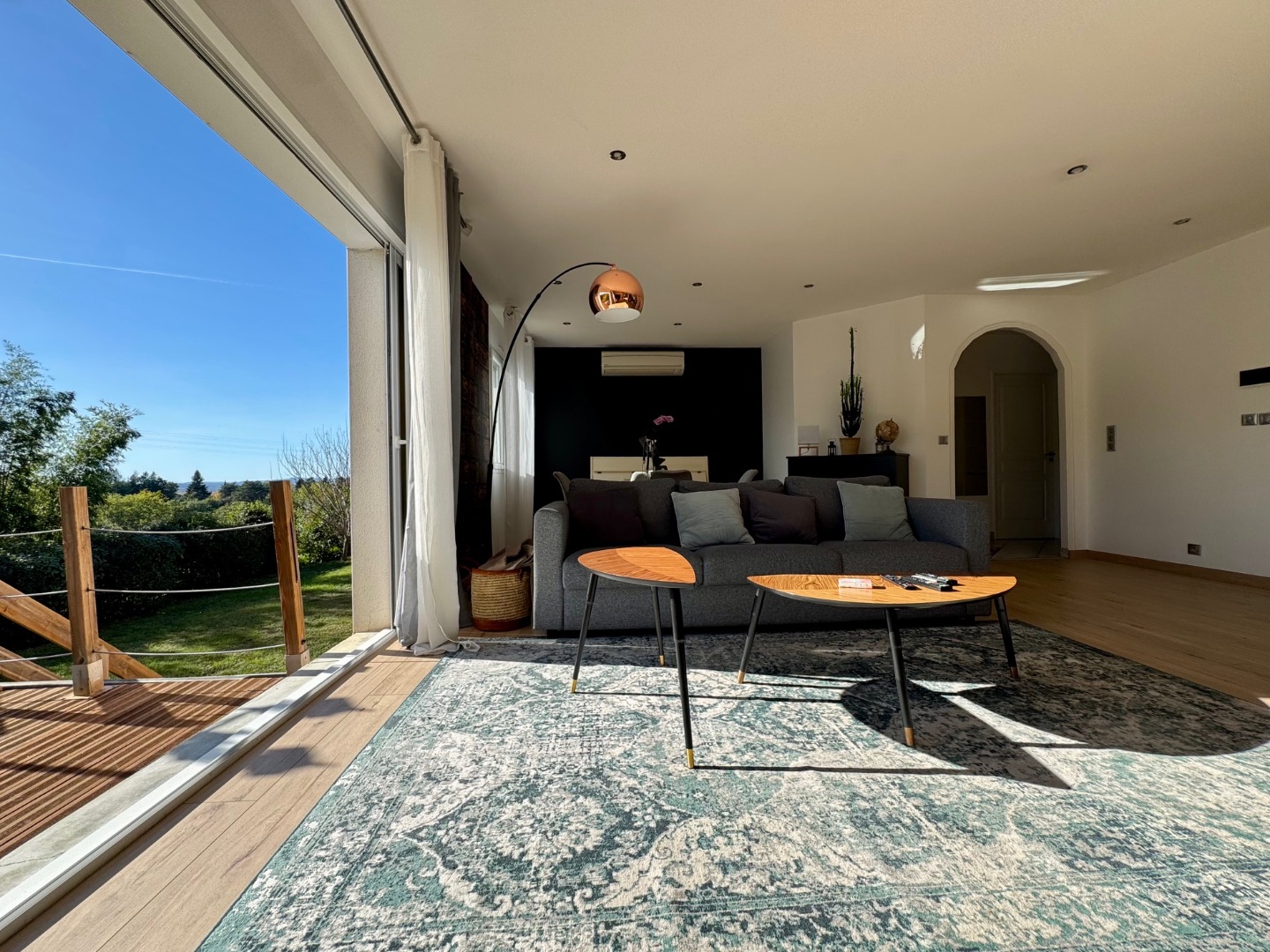 Vous serez séduit dès l’entrée par la spacieuse pièce de vie d’environ 50 m², baignée de lumière grâce à ses deux grandes baies vitrées à galandage ouvrant sur une terrasse bois avec vue dégagée sur la nature environnante.