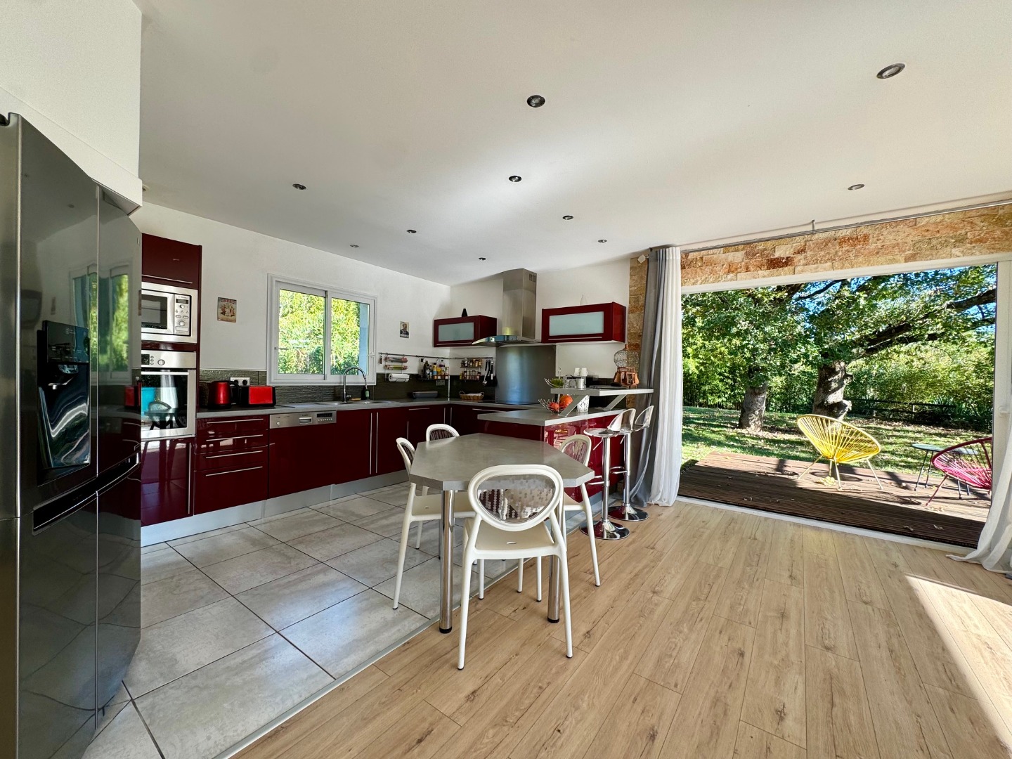 La cuisine ouverte, moderne et entièrement équipée, est prolongée par une arrière-cuisine fonctionnelle.