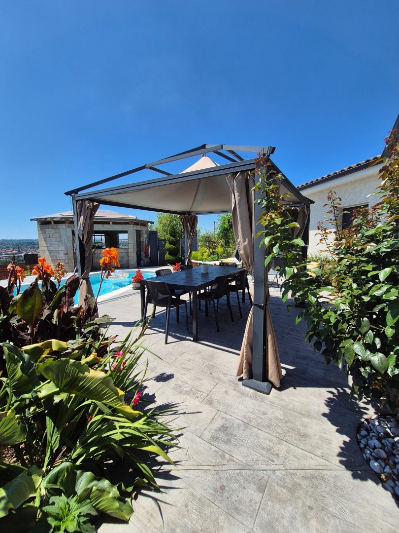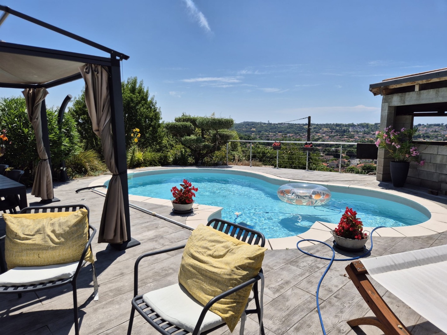 À l’extérieur, vous profiterez d’une grande terrasse pour vos moments de détente, et d’une piscine offrant une vue plongeante sur la vallée. Un pool house, actuellement en attente de finition, ainsi qu’une dalle déjà prête pour la construction d’un garage, viennent compléter l’ensemble.