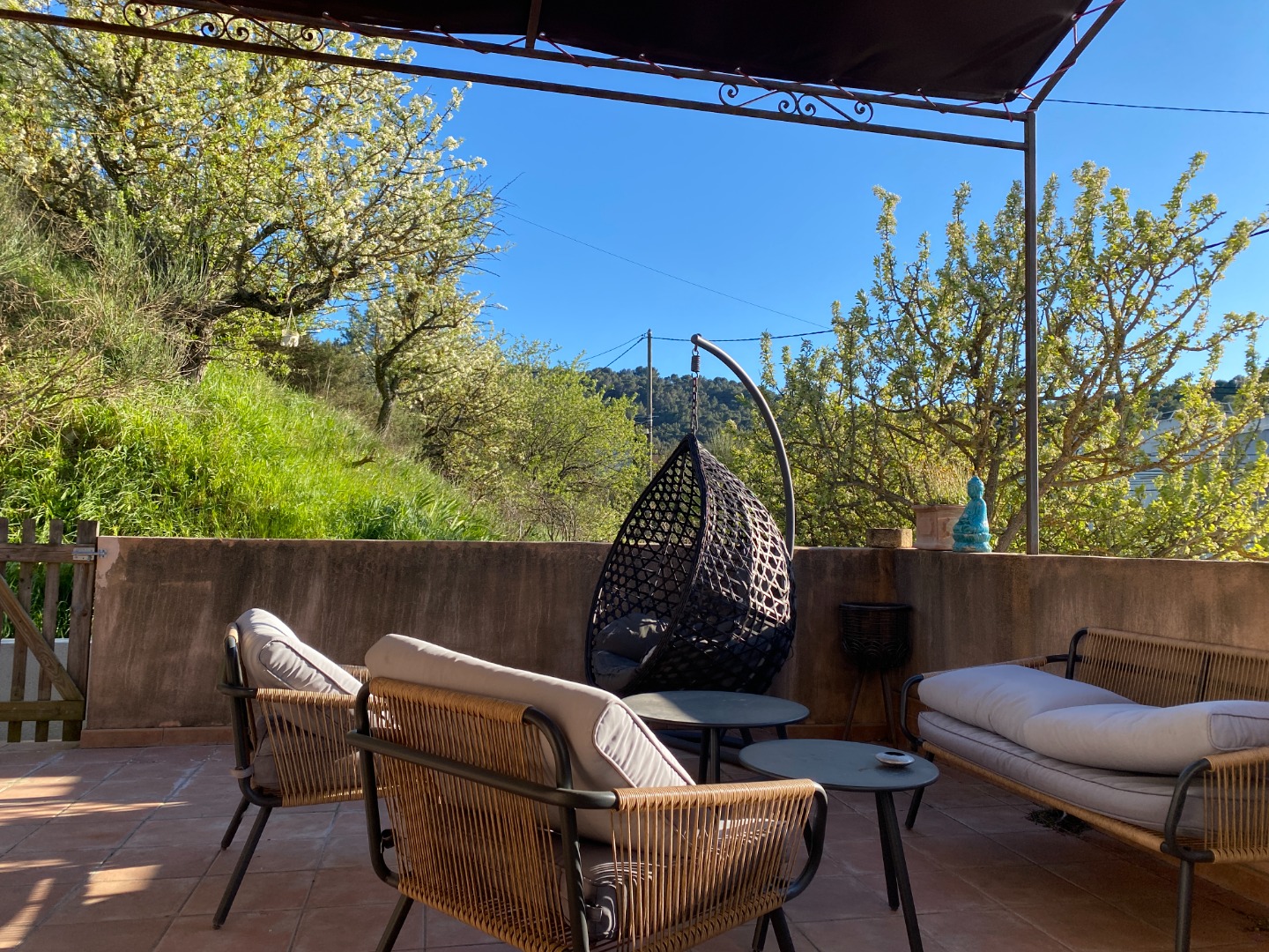 La pièce de vie s’ouvre, par deux larges baies vitrées, sur une terrasse plein sud de 35 m², équipée d’une tonnelle, idéale pour profiter pleinement des beaux jours et de la vue d'un côté sur les toits du village, de l'autre sur la nature environnante.