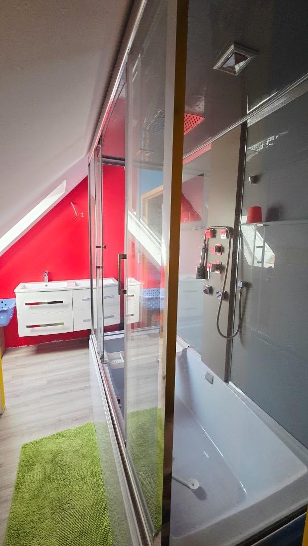 Au rez-de-chaussée : Salle/salon de 32 m² avec poêle à pellets RIKA, cuisine de 8 m², chambre de 9,5 m² et salle de bain de 4 m² ( Douche, vasque et wc).