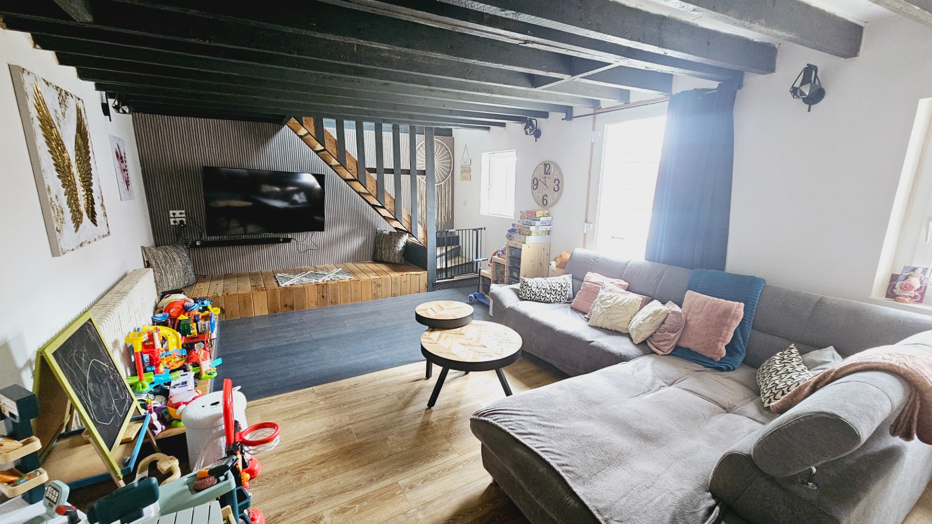 Au rez-de-chaussée : Salle/salon de 28 m², cuisine/salle de bain de 7 m² et une chambre de 19 m².