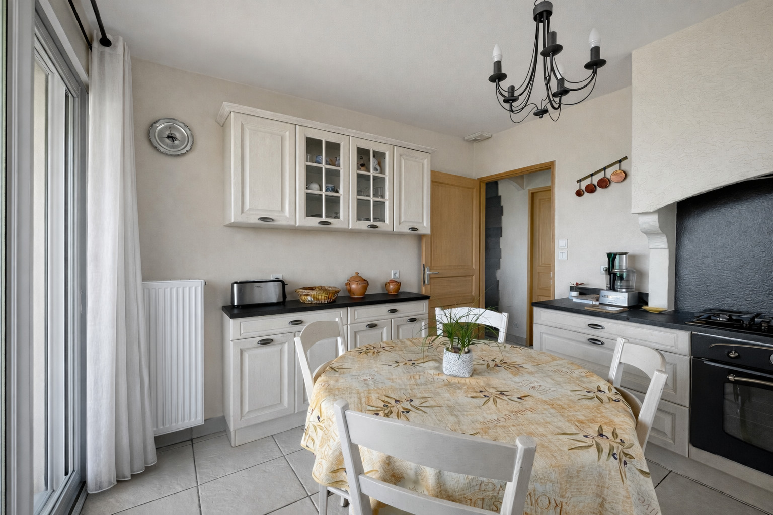 La cuisine indépendante, fonctionnelle et parfaitement entretenue (avec possibilité d’ouverture sur le séjour), dispose d’un cellier attenant, apportant confort et praticité au quotidien.